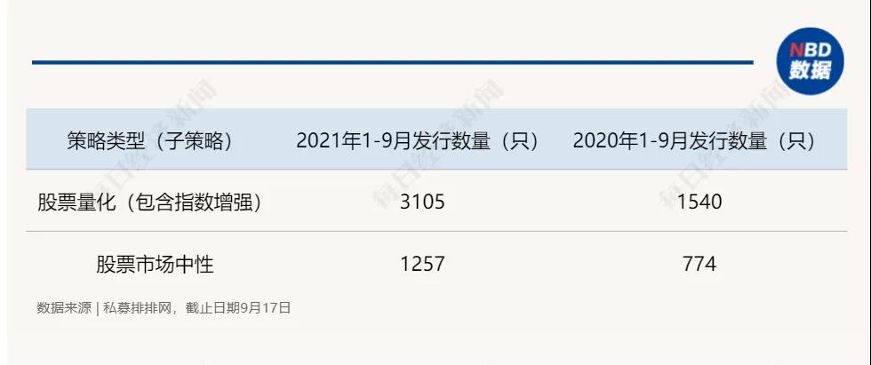 从量化多头策略旗下子策略来看,股票量化(包含指数增强)成为最大赢家。据私募排排网数据,股票量化(包含指数增强)今年以来截至9月17日,目前合计发行了3105只私募产品,而在去年同期股票量化(包含指数增强)合计发行了1540只私募产品,产品发行的增长幅度超101.6%。股票市场中性策略今年以来截至9月17日,合计发行了1257只私募产品,而去年同期合计发行了774只,增长幅度为62.4%。