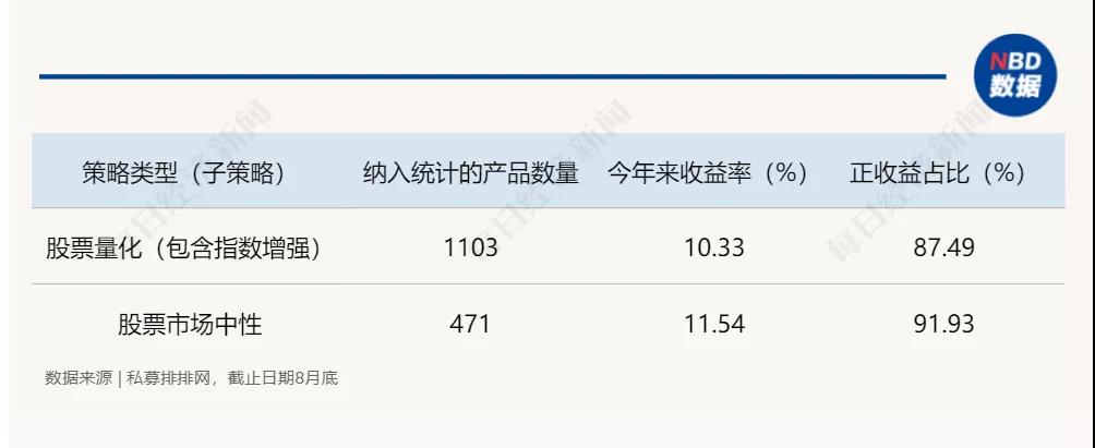 量化多头策略可能采用的策略包括量化多头、市场中性、套利等。据私募排排网统计,今年前八月,合计518只量化多头策略私募产品取得了12.54%的平均收益,冠军由蝶威资产旗下的“蝶威深度智能稳健3号”夺得。股票量化中性产品在多头策略的基础上,同时构建多头和空头头寸以对冲市场风险,将市场涨跌进行剥离,达到获取超额收益的目的。该策略受市场行情的影响相对较小。今年前八月471只股票量化中性策略产品平均收益11.54%,冠军由念空数据科技旗下的“念空灵活对冲2号”取得。