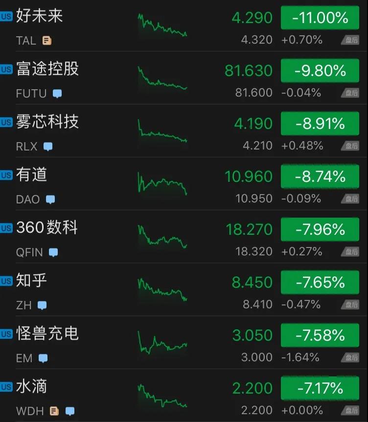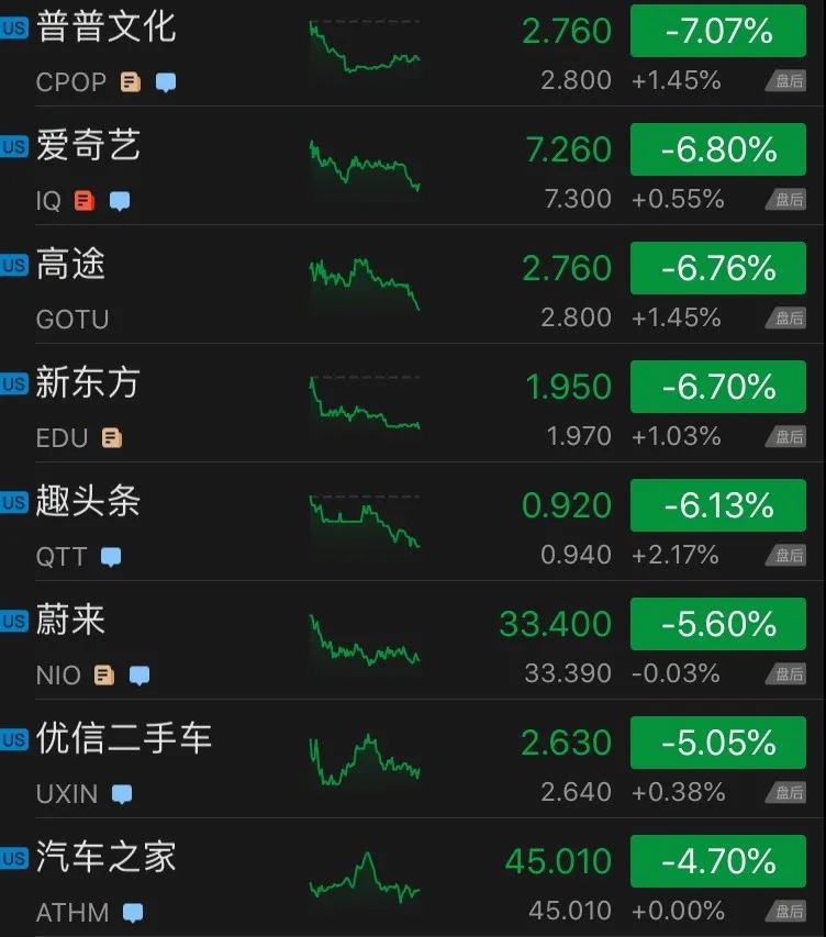 热门中概股大多追随美股下跌。中概ETF KWEB和CQQQ分别收跌逾3%和2%。个股中,阿里巴巴、百度和拼多多跌超3%,京东跌近1%,腾讯ADR跌1.7%,哔哩哔哩跌超4%,好未来跌约11%,爱奇艺跌6.8%。“造车三剑客”中,理想汽车跌2.7%,小鹏汽车跌3.8%,蔚来汽车跌5.6%。